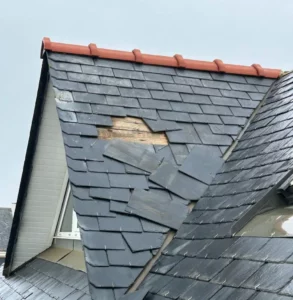 Tuiles ou ardoises endommagées : Matériaux cassés, fissurés, déplacés ou manquants en grand nombre.