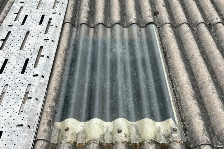 Remplacement de tôle translucide sur bâtiment industriel Remplacment d’une tôle opaque rouillée par une tôle translucide laissant passer la…
