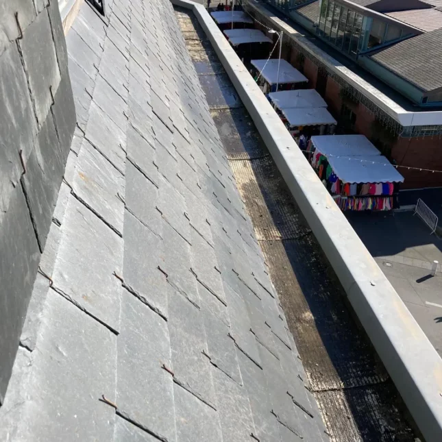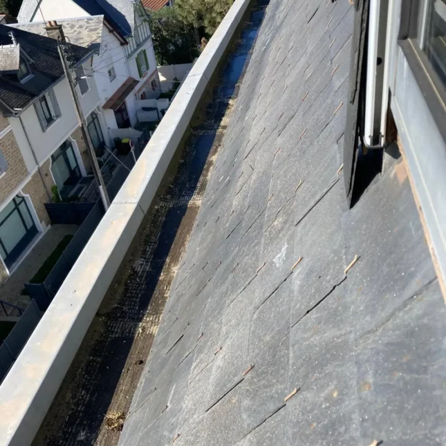 Entretien de toiture d’un immeuble à Vannes en Morbihan, contrôle des ardoises et des zingueries + remplacement des ardoises abîmées.