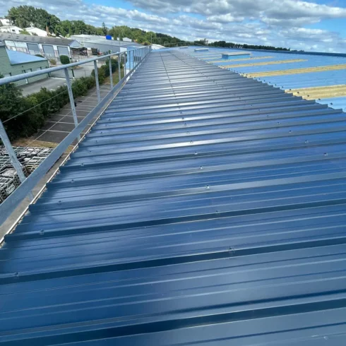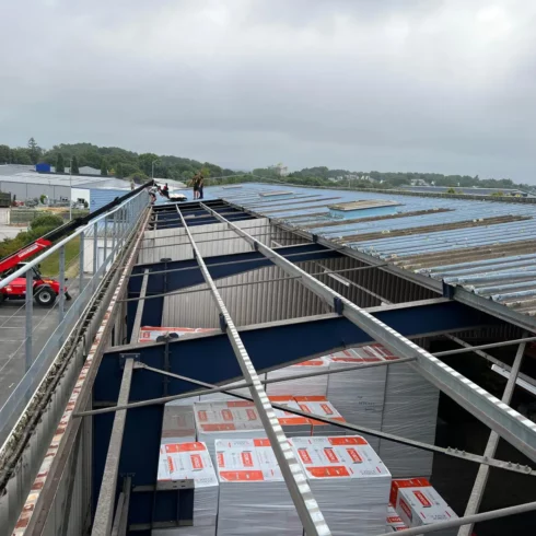 Remplacement de tole d’une toiture metallique d’un bâtiment professionnel en Morbihan.