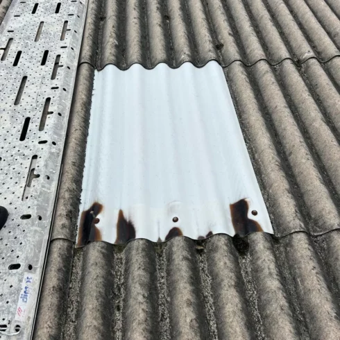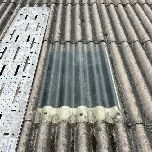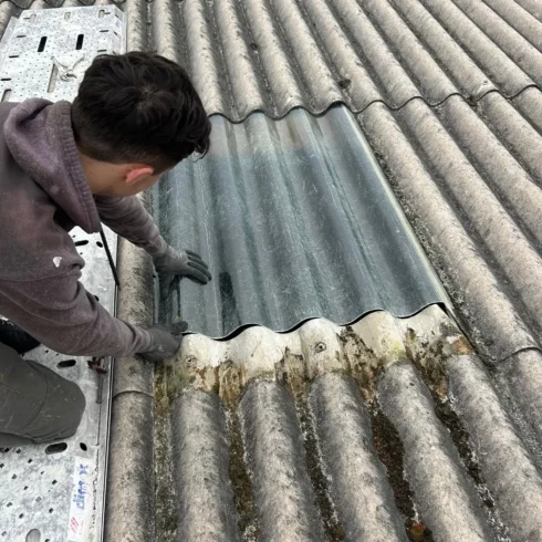Remplacment d’une tôle opaque rouillée par une tôle translucide laissant passer la lumière du jour tout en étant étanche et résistante.